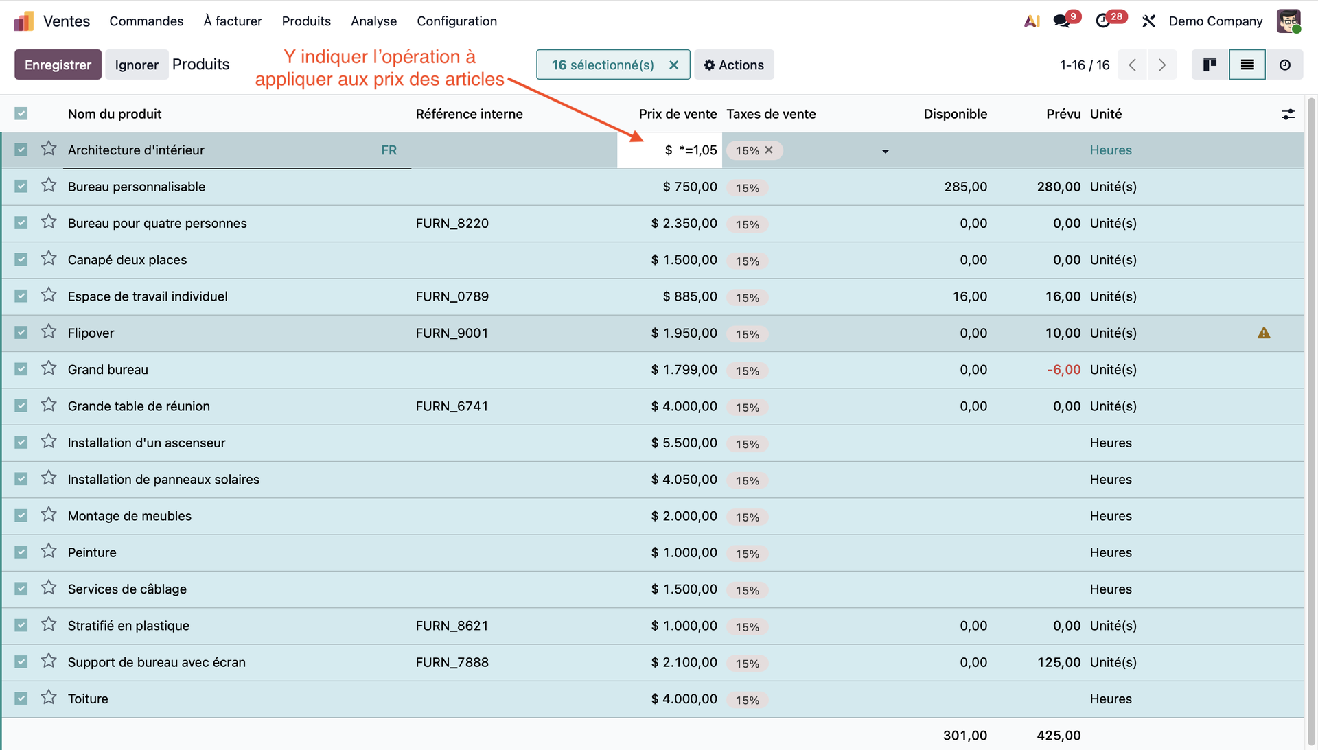 Dans un contexte dans lequel les prix évoluent constamment avec : les taxes, le coût des matières premières ... modifier manuellement des dizaines de lignes d'un devis est une tâche longue, pénible et peut mener à des erreurs. Heureusement pour nous, Odoo 19 est là pour nous prémunir de ces inconvénients ! Il est maintenant possible d'appliquer une opération simple à toutes les lignes d'un devis. Augmenter les prix de quelques pourcents ou appliquer une remise sont des tâches qui peuvent s'avérer fastidieuses, mais elles ne se font plus qu'en quelques clics avec Odoo 19 !