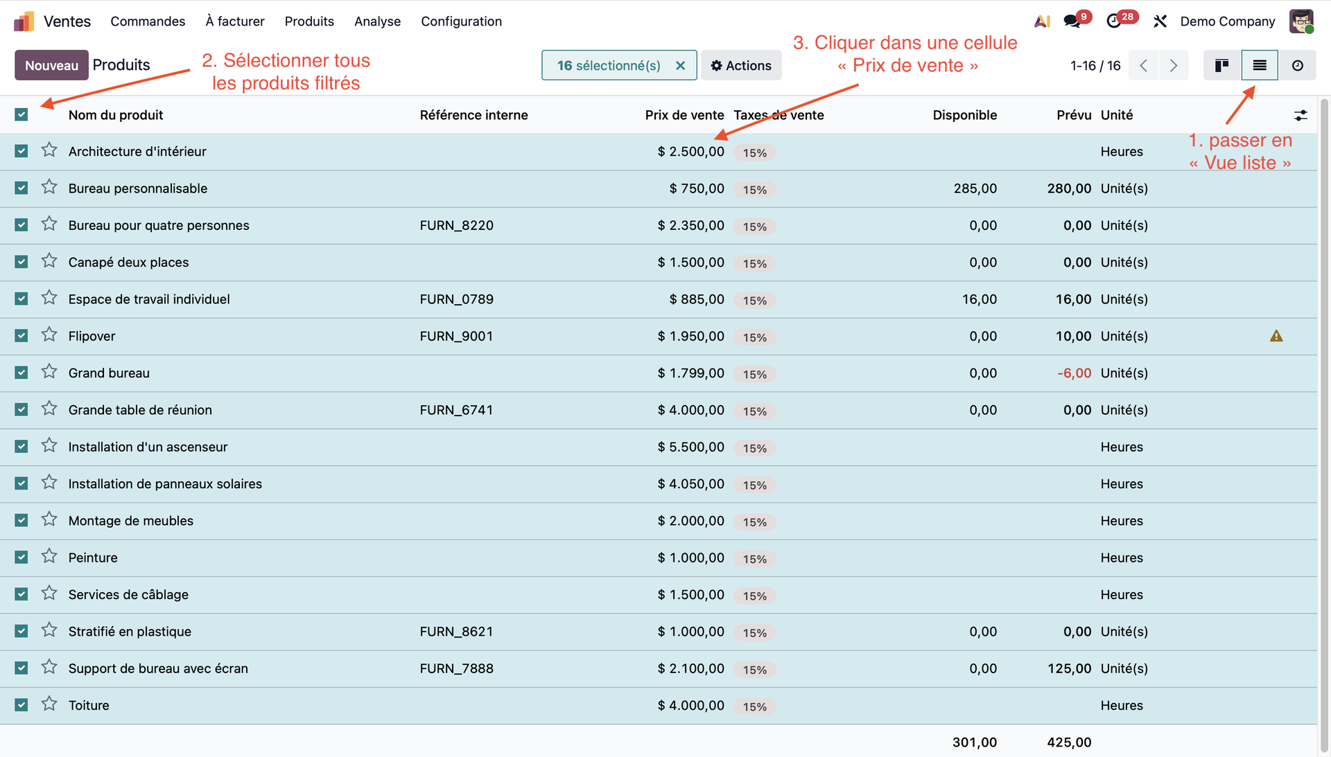 Notre objectif aujourd'hui va être d'augmenter de cinq pourcents tous les articles d'une valeur strictement supérieure à sept cents euros. Depuis le module Ventes, nous allons pouvoir filtrer nos produits.