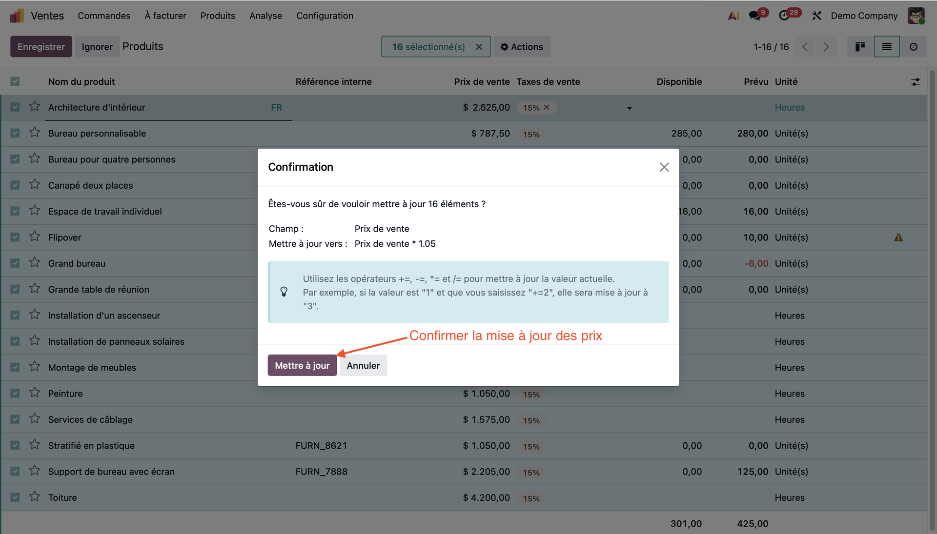 Il nous reste alors simplement à valider le contenu de notre cellule avec Enter. Une fenêtre de confirmation va ensuite s'ouvrir pour s'assurer que l'on veuille bien appliquer notre modification du prix de vente pour les articles sélectionnés. Il n'y a plus qu'à valider en cliquant sur le bouton Mettre à jour dans le coin inférieur gauche de la fenêtre.